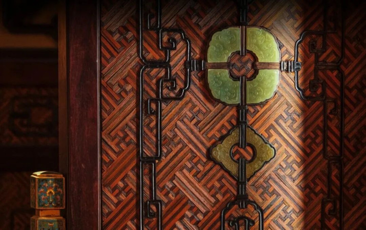 竹丝镶嵌工艺来自我国南方地区,是在木胎或竹胎表面,用竹丝拼嵌出复杂纹样。倦勤斋、符望阁、延趣楼的挂檐板、炕沿板和落地罩上,直径仅半毫米的竹丝被染成黑、褐、红等不同颜色,拼出多种几何纹样,是竹丝镶嵌工艺在北方建筑上应用的罕见实例。